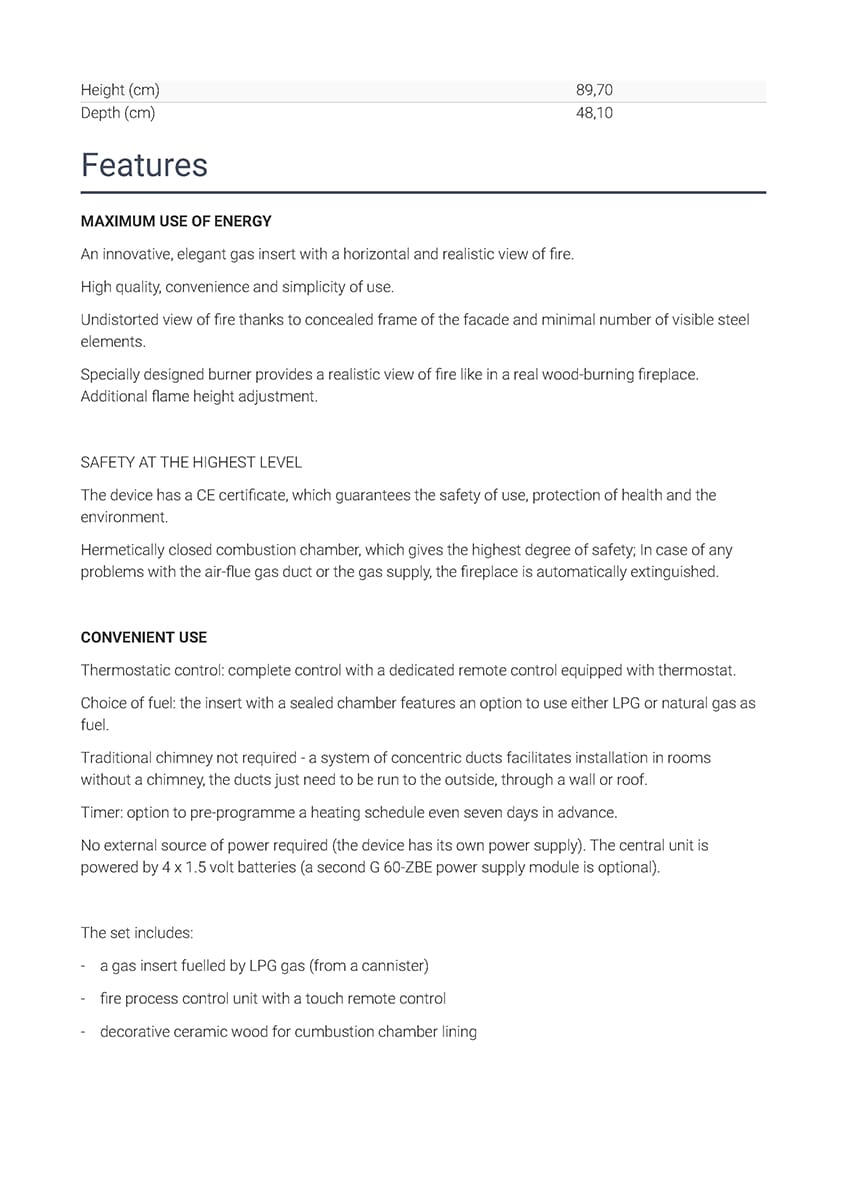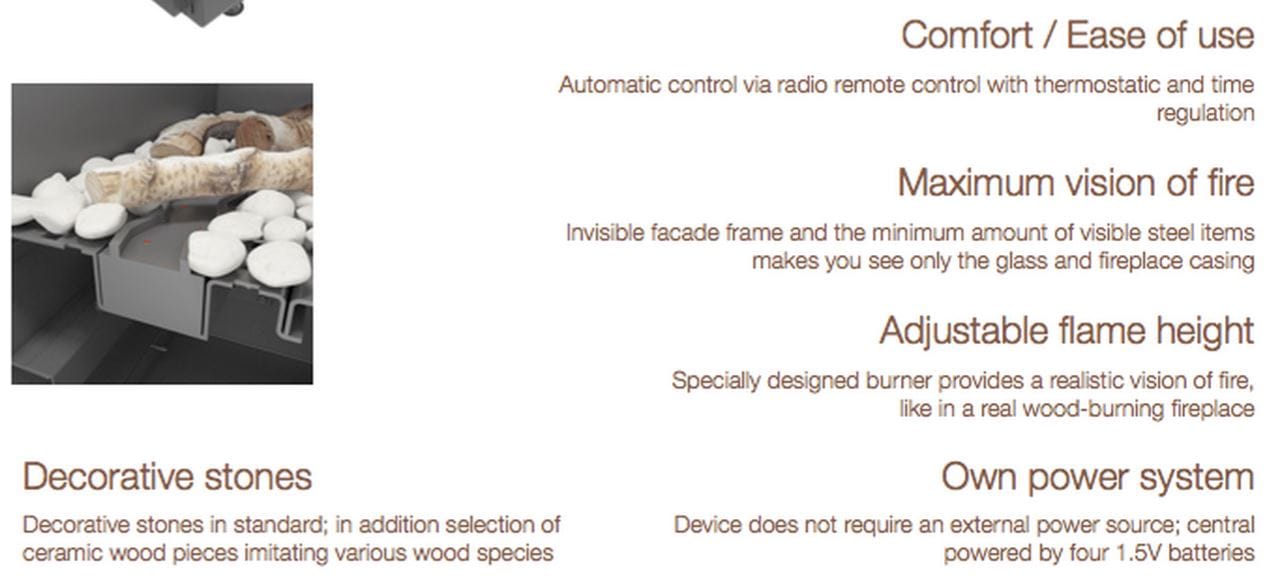 The fireplace also features a timer, enabling you to pre-program a heating schedule up to seven days in advance. Additionally, it operates independently of external power sources, with its own power supply powered by 4 x 1.5V batteries (an optional G 60-ZBE power supply module is available).