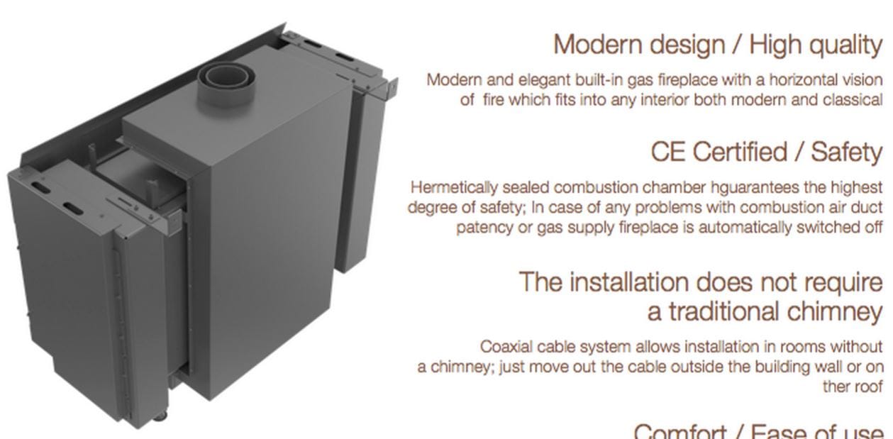 The steel gas fireplace in Cyprus comes with a CE certificate, ensuring both safety and environmental protection. Its hermetically sealed combustion chamber offers the highest safety standards. In the event of any issues with the air-flue gas duct or gas supply, the fireplace automatically shuts off, preventing any risks.