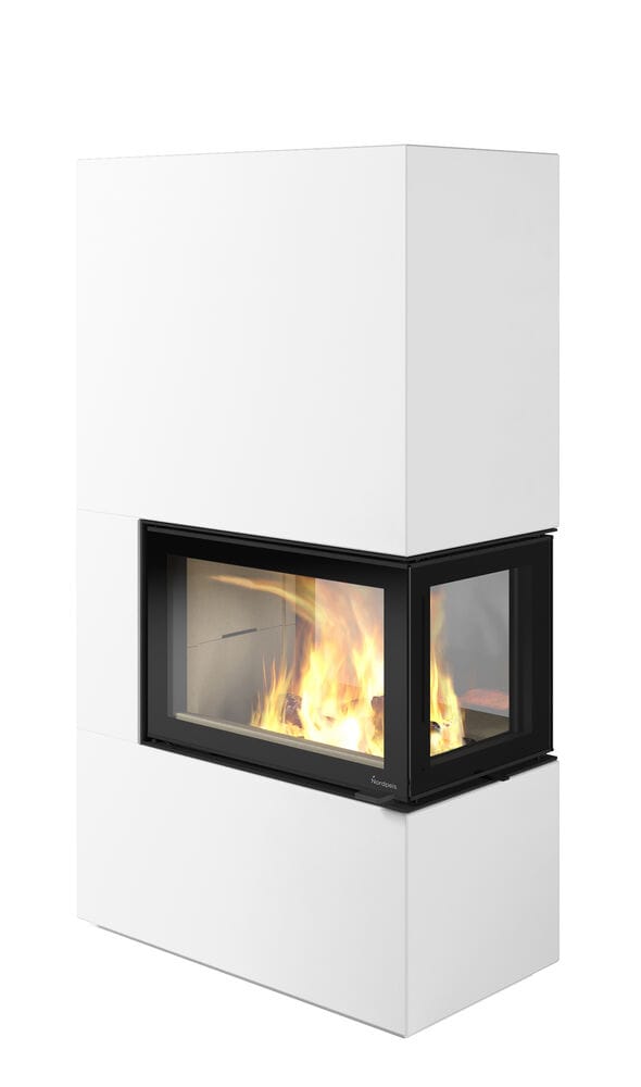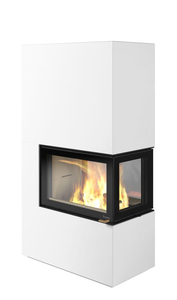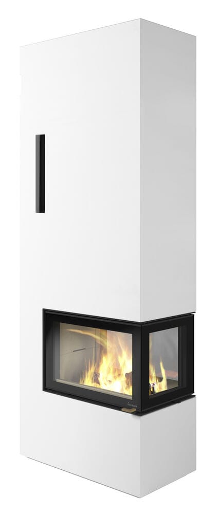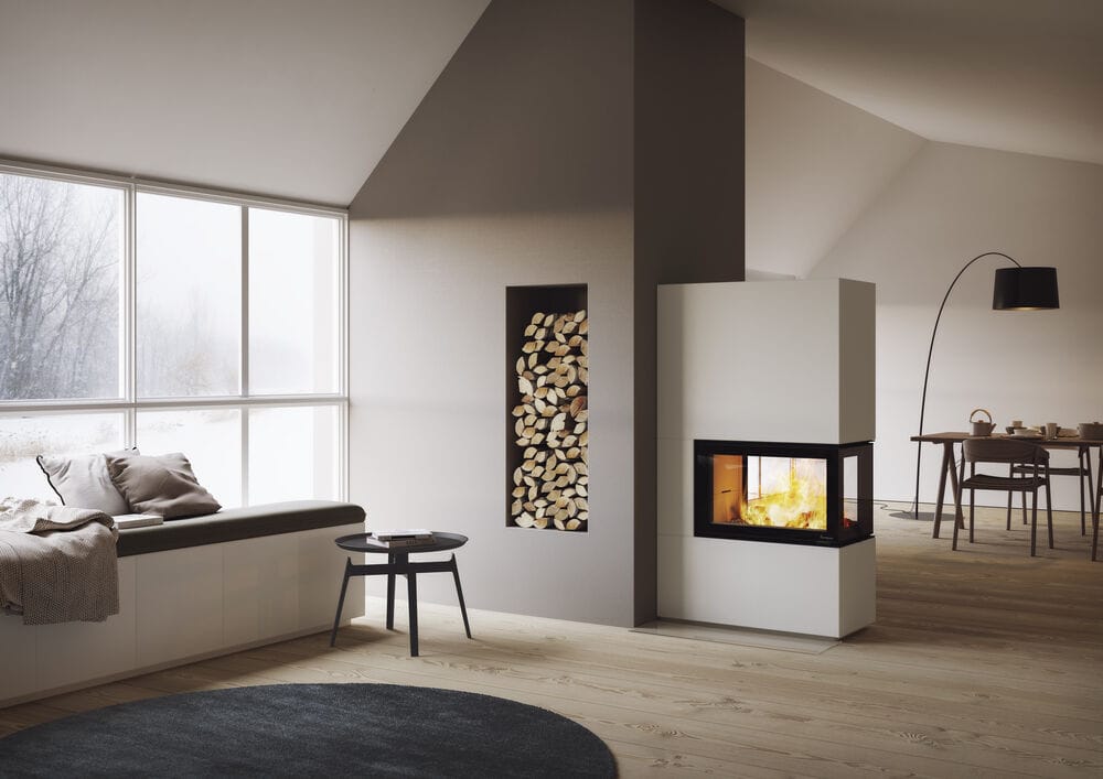 The Davos P fireplace features a panoramic insert with double glazing on all sides, ensuring efficient combustion and cleaner glass. Designed for ease of use, it offers a stunning, unobstructed view of the flames from the front and both sides. Its large glass panels make it an excellent choice as a see-through fire, ideal for use as a stylish and functional room divider in modern interiors.